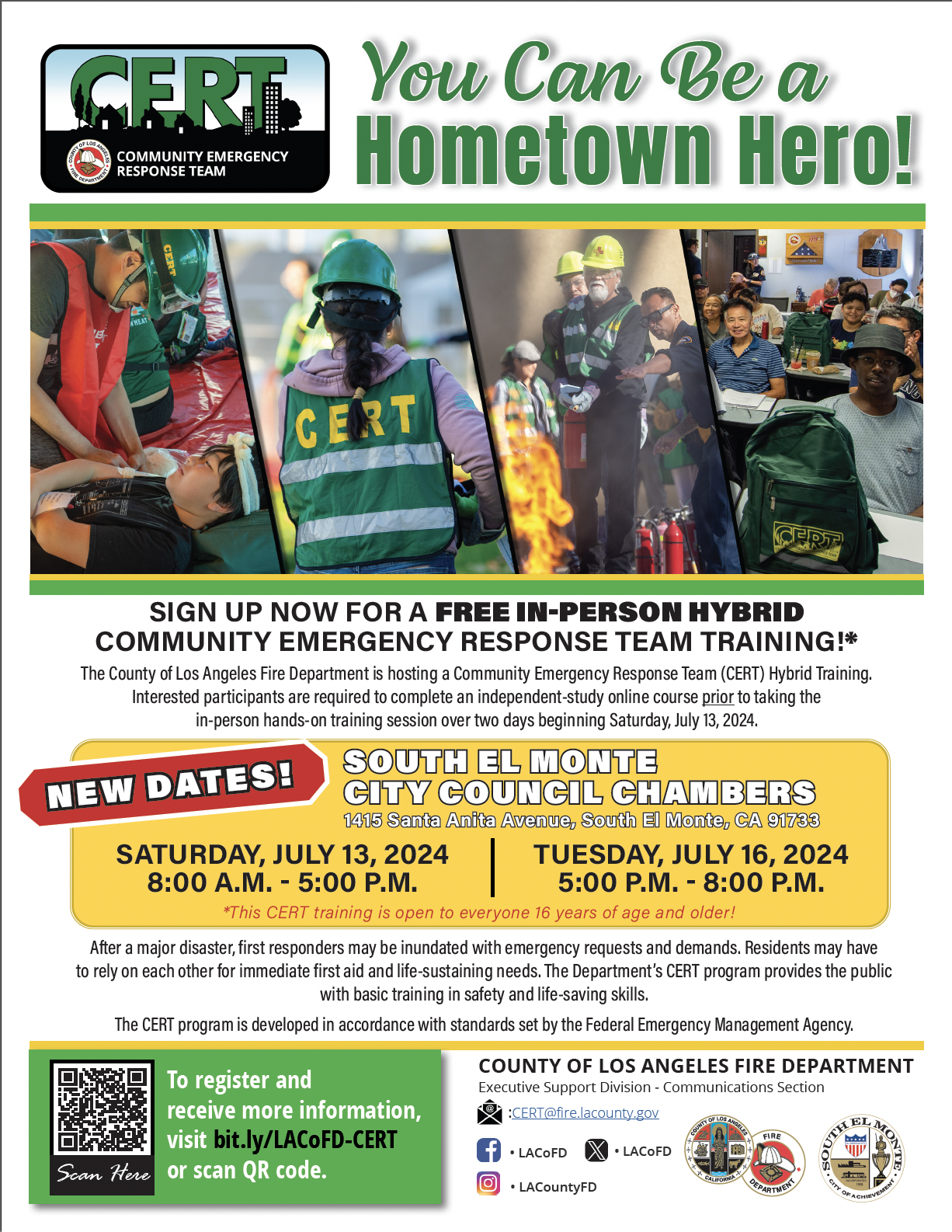 The County of Los Angeles Fire Department is hosting a Community Emergency Response Team (CERT) Hybrid Training.
