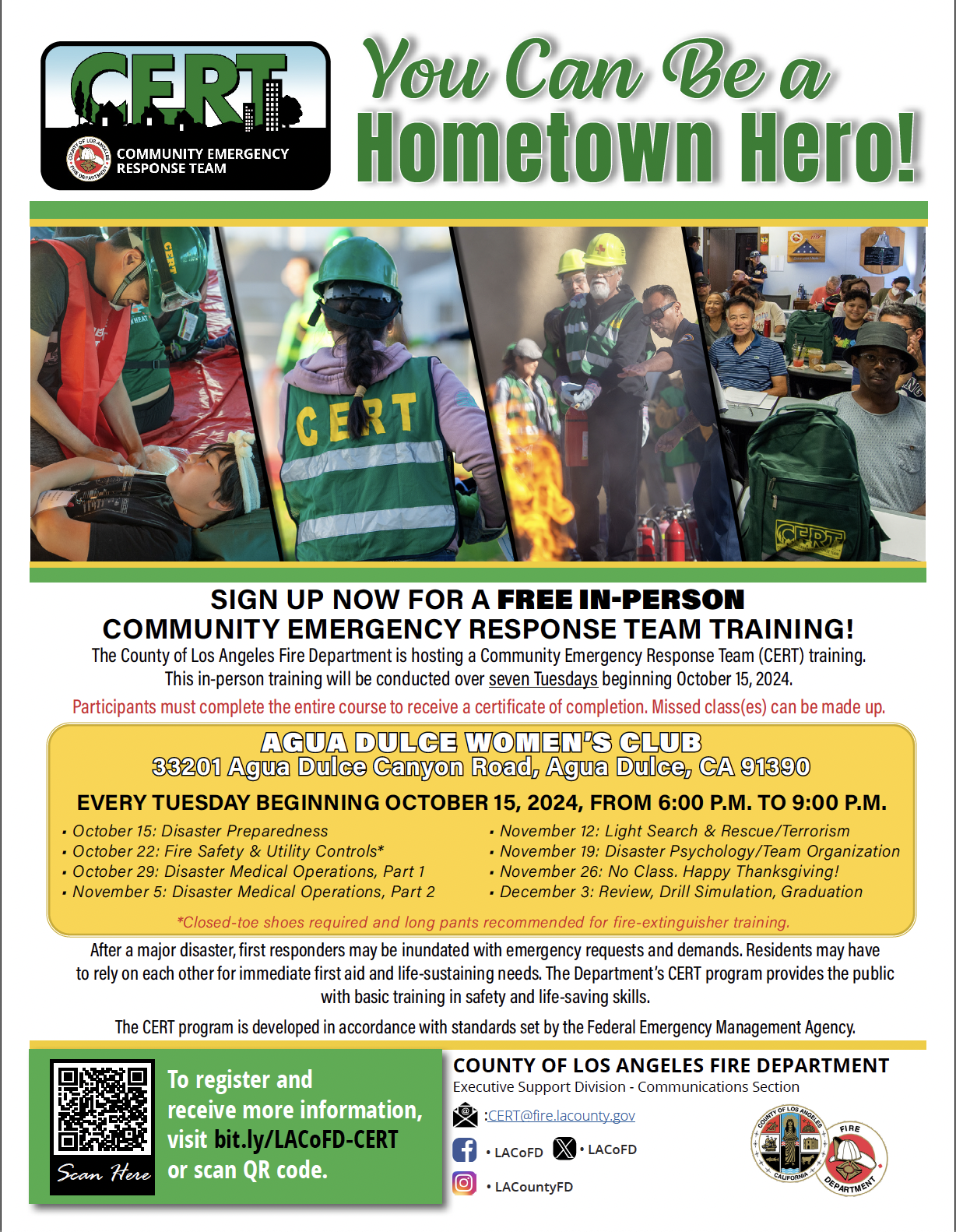 The County of Los Angeles Fire Department is hosting a Community Emergency Response Team (CERT) Training in the City of Agua Dulce.