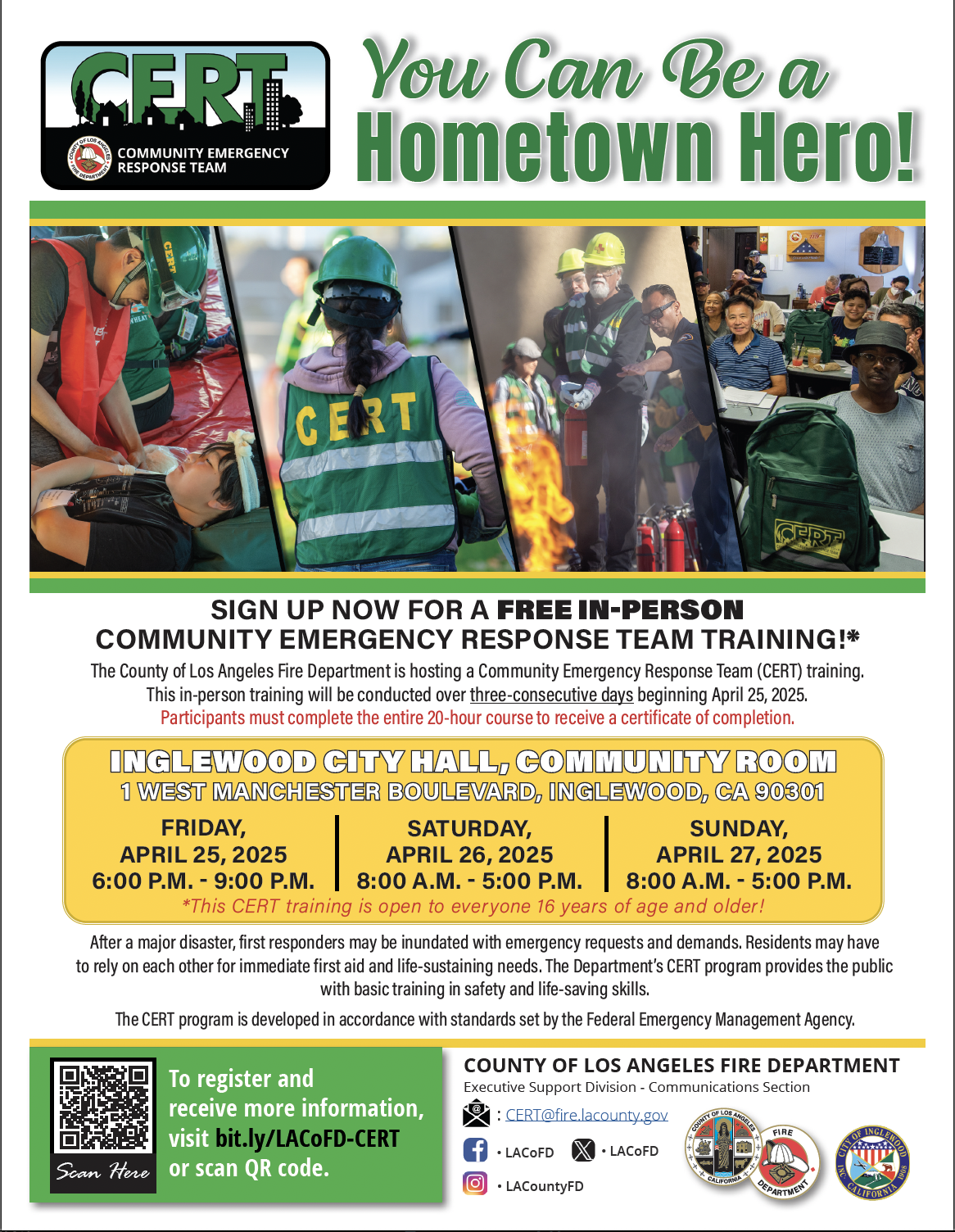 The County of Los Angeles Fire Department is hosting a Community Emergency Response Team (CERT) Training in the City of Inglewood.