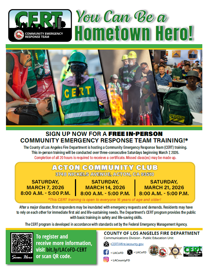 The County of Los Angeles Fire Department is hosting a Community Emergency Response Team (CERT) Training in Acton.*