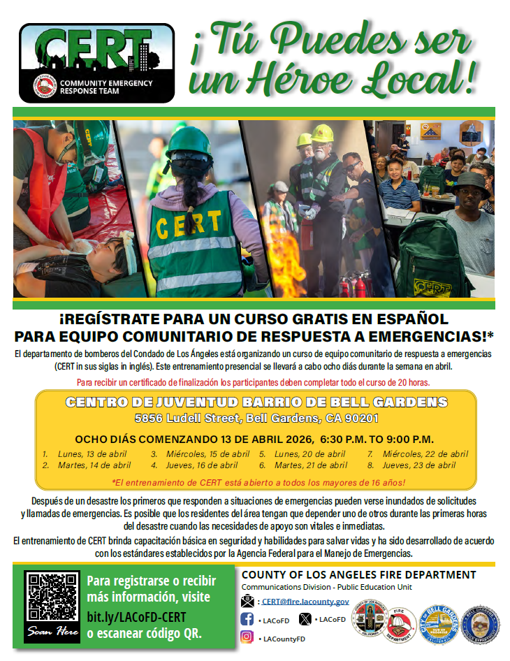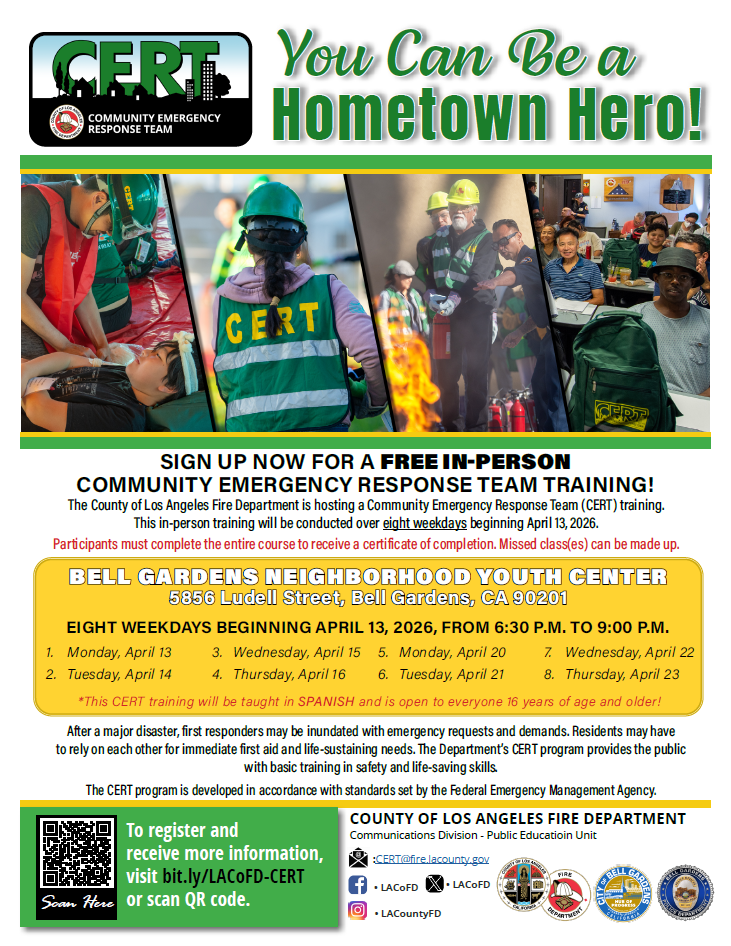 The County of Los Angeles Fire Department is hosting a Community Emergency Response Team (CERT) Training in the City of Bell Gardens.*