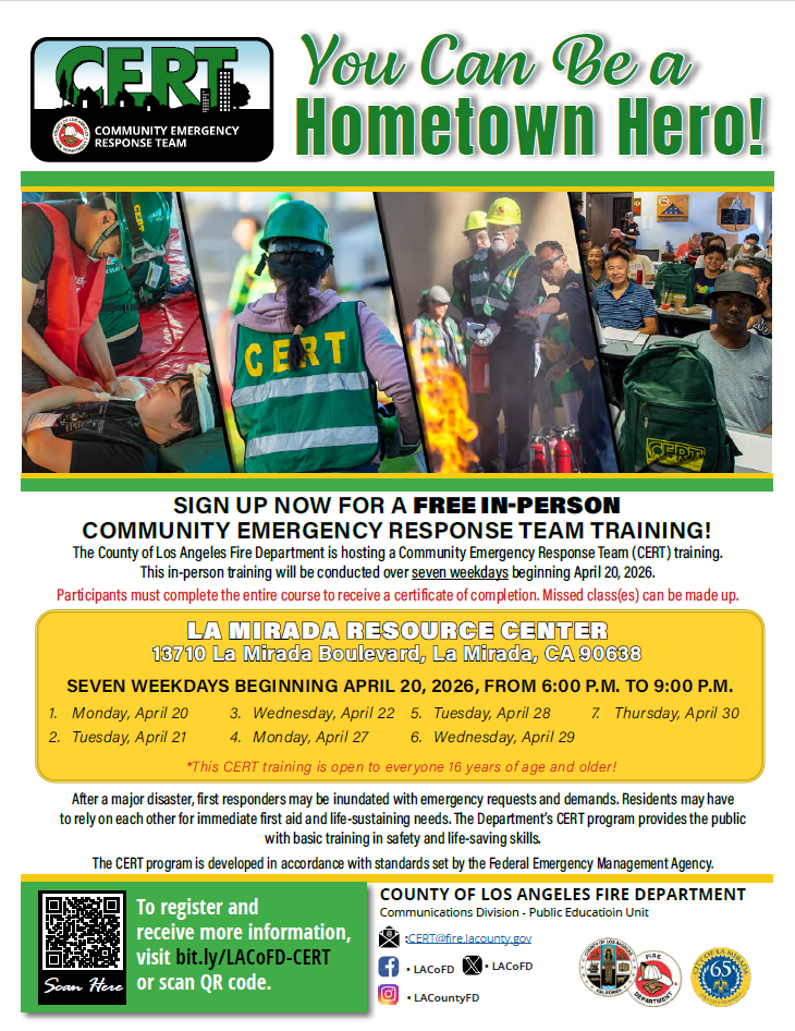 The County of Los Angeles Fire Department is hosting a Community Emergency Response Team (CERT) Training in La Mirada.*